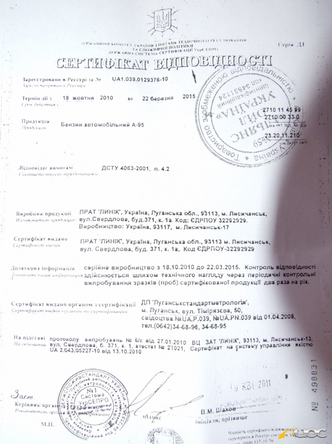 В документах упоминается А-95 производства ЧАО «ЛИНИК», при этом само предприятие (Лисичанский НПЗ) было остановлено год назад и не перерабатывает нефтепродукты с марта прошлого года. Также на снимках видно, что документы не потеряли своей актуальности и указывают, что бензин был произведён в июле 2012 года, то есть уже на закрытом предприятии. Не исключено, конечно, что юридическое лицо продолжает поставлять бензин на заправки, но не производит топливо.
